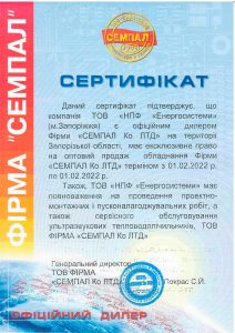 Компанія ТОВ «Науково-виробнича фірма «ЕНЕРГОСИСТЕМИ» » є офіційним дилером Фірми «СЕМПАЛ Ко ЛТД» на території Запорізької області, має ексклюзивне право на оптовий продаж обладнання Фірми «СЕМПАЛ Ко ЛТД». Також має повноваження на проведення проектно-монтажних і пусконалагоджувальних робіт, а також сервісного обслуговування ультразвукових тепловодолічильників